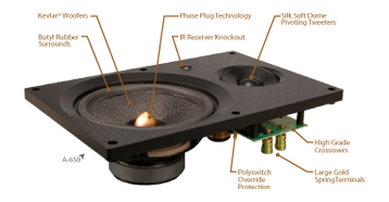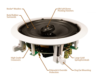 Silk soft dome tweeters deliver natural, uncolored high frequency audio evenly over a wide dispersion pattern.  Ferro Fluid is used in the voice coil gap to lubricate and cool it.  This significantly increases power handling and improves transient response.  The pivoting feature allows the already wide dispersion pattern to be aimed directly at the central seating / listening area delivering a seamless, transparent and coherent sound space.